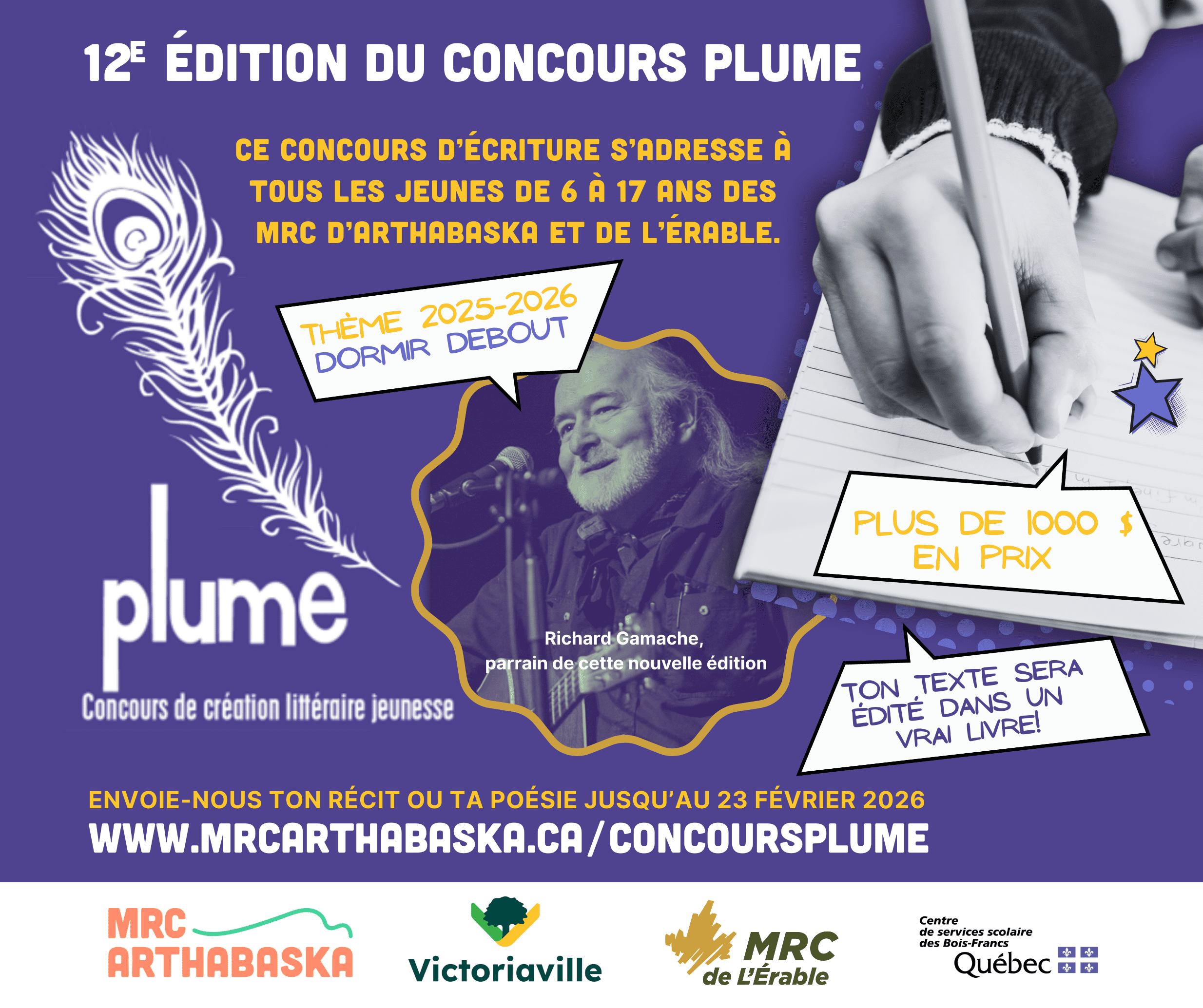 Le Concours de création littéraire jeunesse Plume est de retour pour une 12e édition. La MRC d’Arthabaska et la Ville de Victoriaville, en partenariat avec la MRC de L’Érable et le Centre de services scolaire des Bois-Francs, invitent les jeunes de 6 à 17 ans qui rêvent de publier leur œuvre littéraire dans un recueil à laisser libre cours à leur imagination et à soumettre leur texte pour participer au concours.