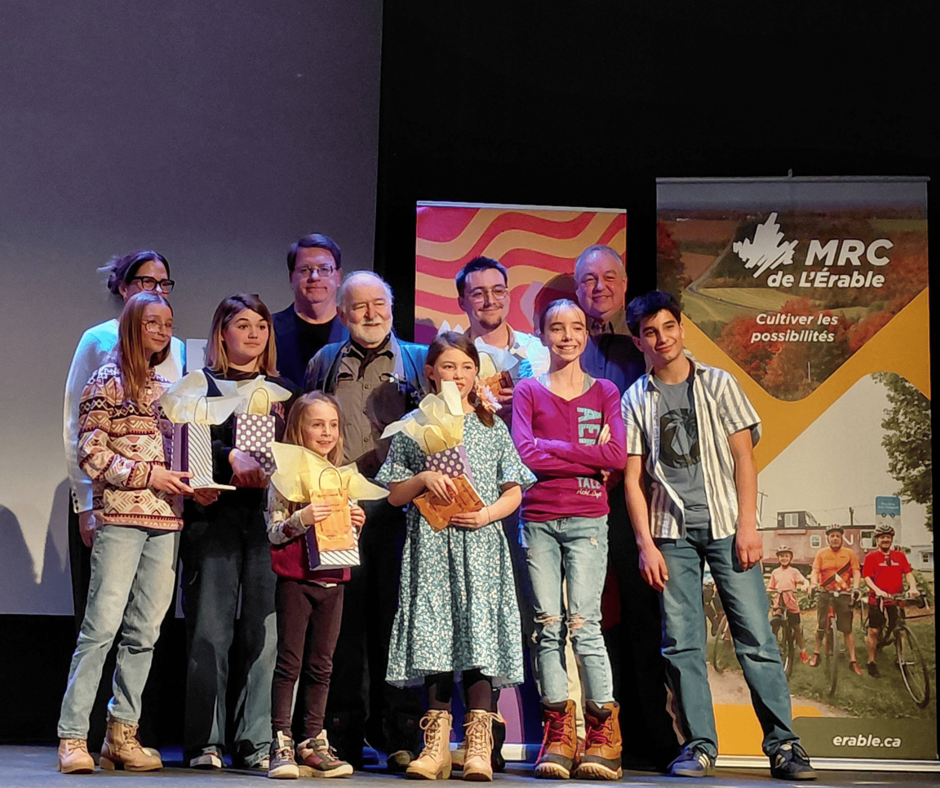 Les lauréates et les lauréats de cette 12e édition du Concours Plume, accompagnés par Julie Ricard, mairesse de Sainte-Clotilde-de-Horton et préfète suppléante de la MRC d’Arthabaska, Vincent Bourassa, maire de Victoriaville, Richard Gamache, palabriste, auteur-compositeur et parrain de l’édition, et Gervais Pellerin, maire d'Inverness et préfet de la MRC de L'Érable.